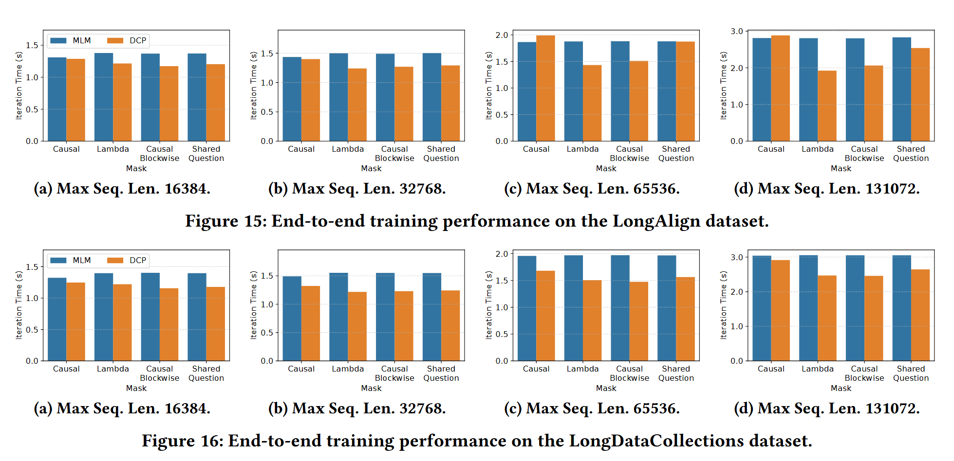End-to-end eval 设置:在 8 个 AWS EC2 p4de.24xlarge 实例(64 张 A100 GPU)上,使用 LongAlign 和 LongDataCollections 数据集,训练 8B 参数 GPT 模型,比较 DCP 与集成在 Megatron-LM 中的增强版 TransformerEngine。