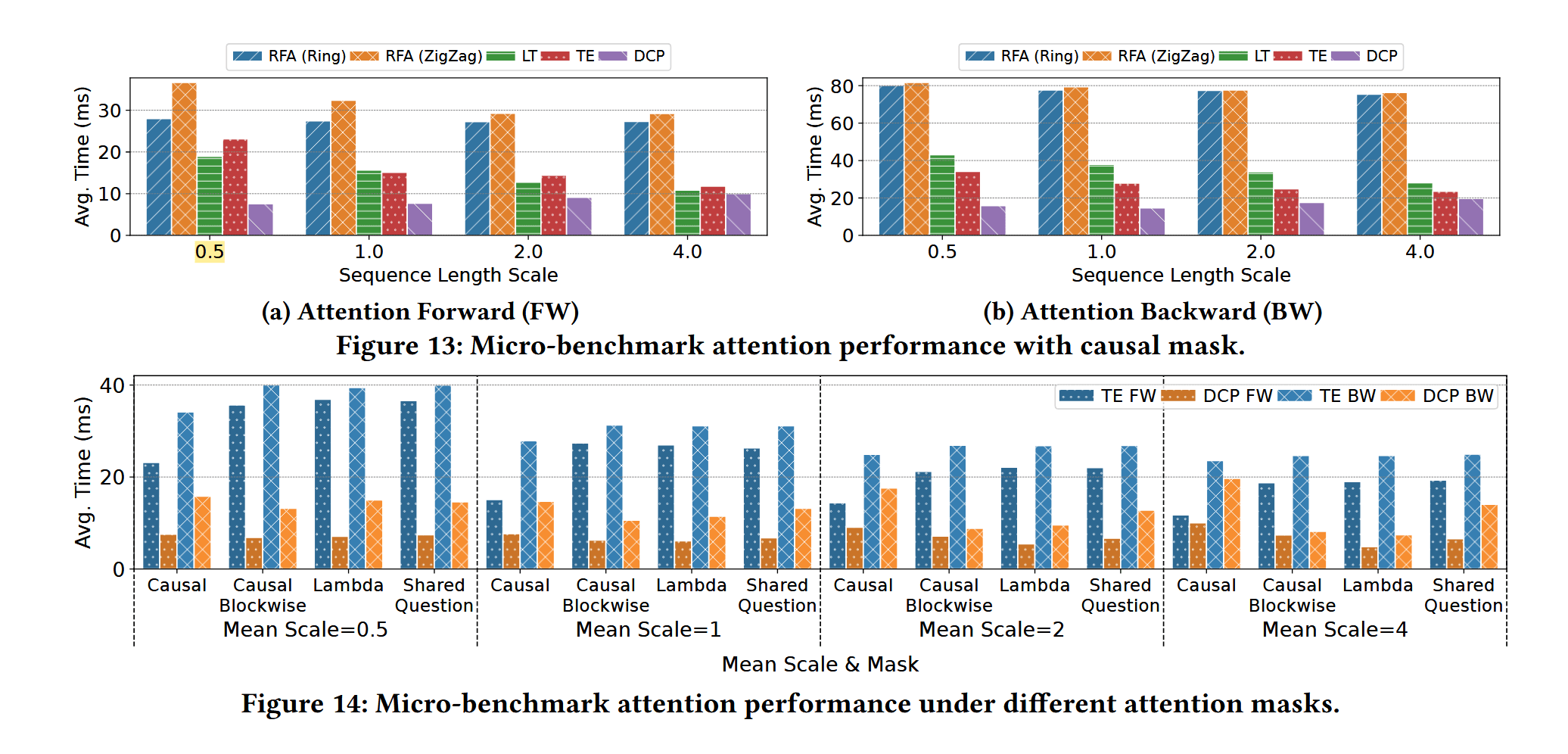 Mirco-benchmark (attention op) 设置:在 4 个 AWS EC2 p4de.24xlarge(32张A100 GPU)上,使用 LongDataCollections 数据集,比较 DCP 与 RFA、LoongTrain、TransformerEngine。