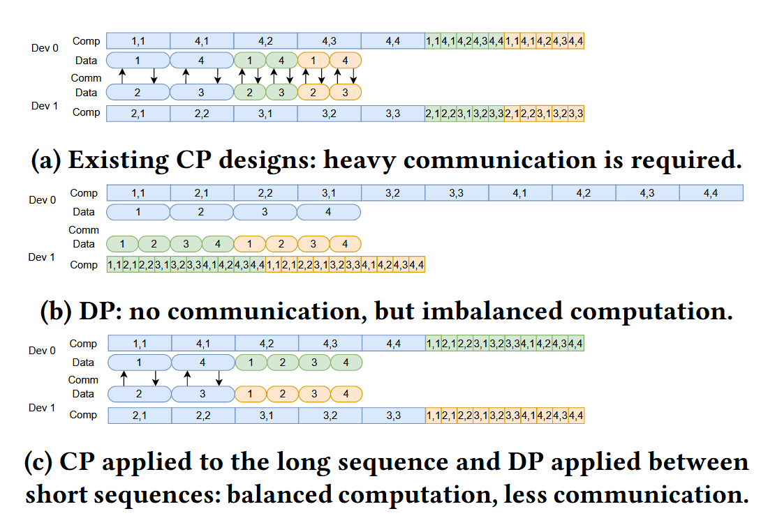 - varlen,虽然内存、计算是均衡了,通信是冗余的,不管长短都要通信。可以 CP 长,DP 短,见下图。
