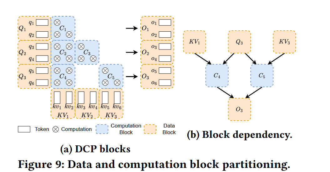 - 根据 mask,把 data,分析作为单 head 的 Q, KV, C, O(C 指计算块) 的 block 来分析,求解 memory 和 communication 的均衡解,即 placement。